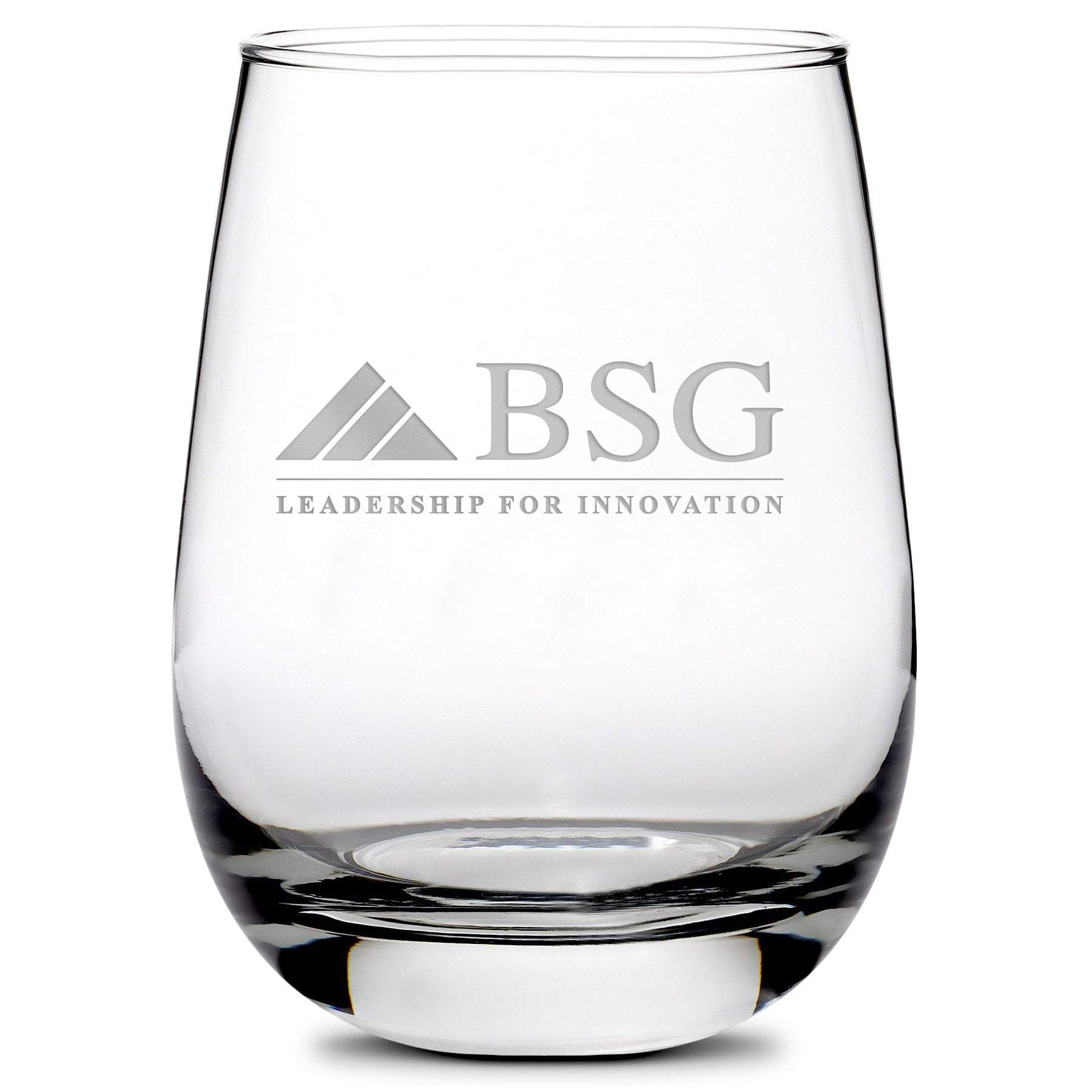 Custom BSG Stemless Wine Glass, Boston Search Group, Laser Etched or Hand Etched