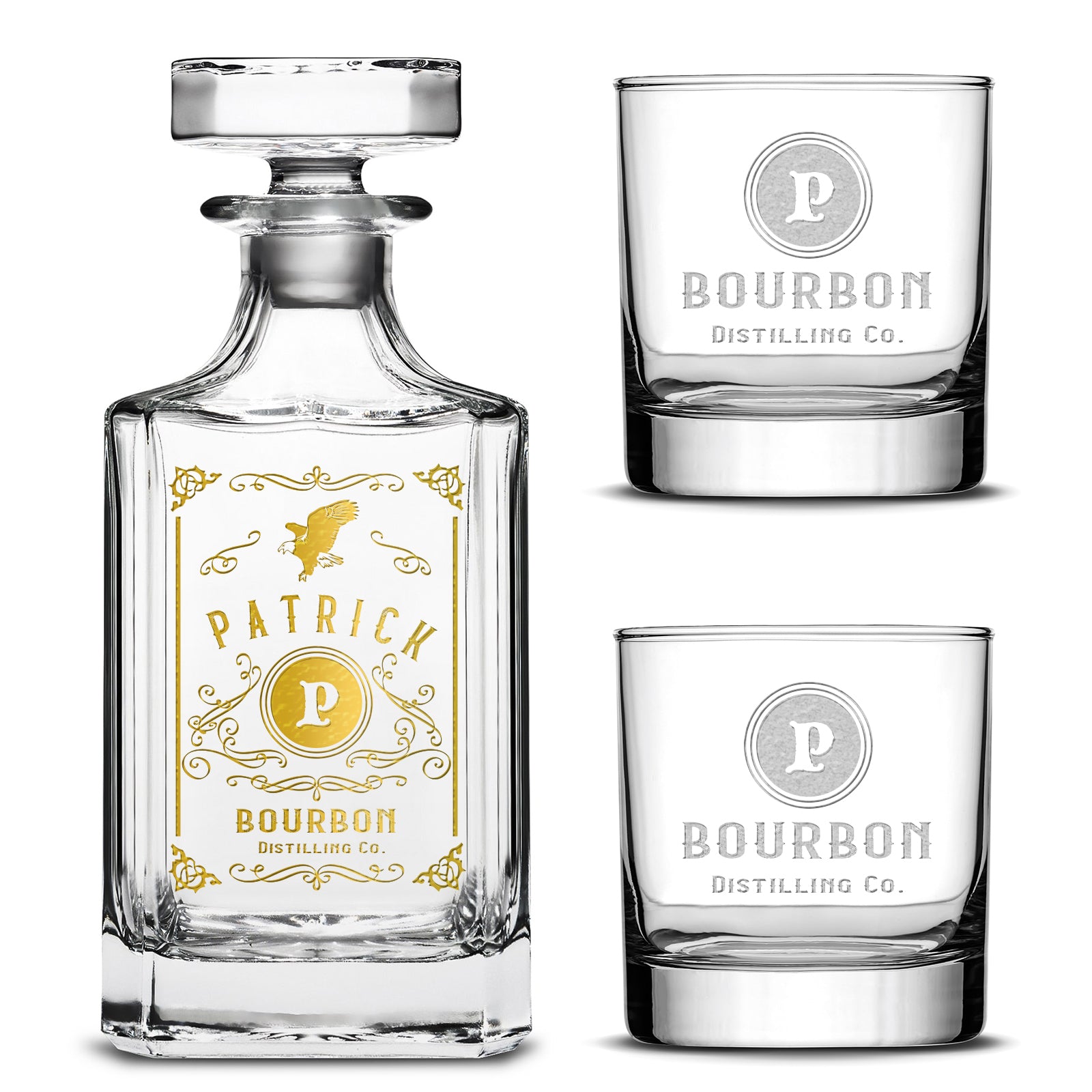 Customizable, Premium Diamond Style Liquor Decanter and (Set of 2) Premium Whiskey Glasses, Handmade, Handblown, Hand Etched Gifts, Sand Carved, 750ml, Laser Etched or Hand Etched
