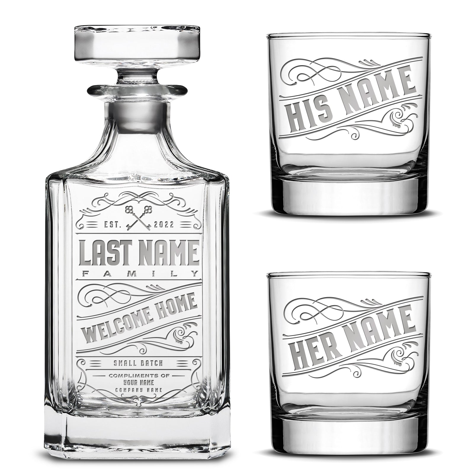 Customizable Welcome Home Diamond Decanter with Set of 2 Custom Whiskey Glasses, Laser Etched or Hand Etched