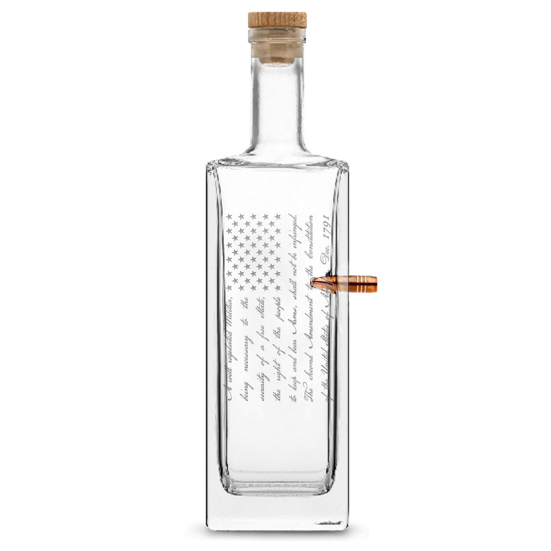 Premium .50 Cal BMG Bullet Bottle, Liberty Whiskey Decanter Cork Stopper, 2nd Amendment Flag, 750mL, Laser Etched or Hand Etched